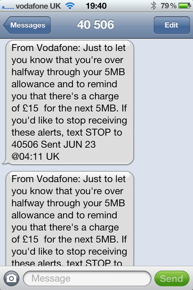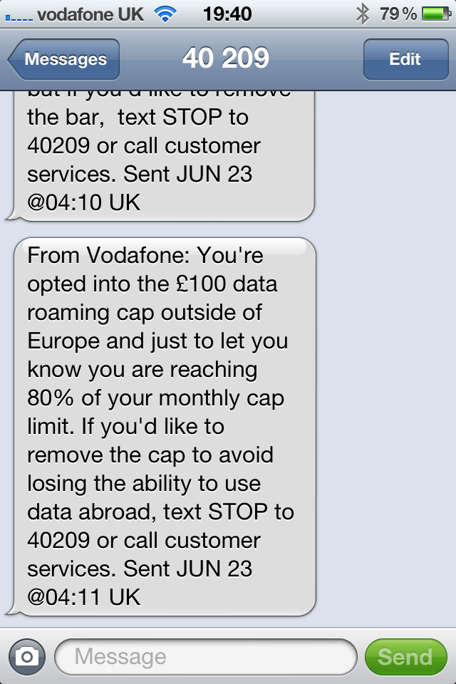 It gets worse. Vodafone send me texts (above) saying that I was halfway through my 5MB data allowance. At no point did they say I had used up the 5MB allowance. So I was appalled to get a further text saying I had used up 80% of the £100 cap on data outside Europe (below). So Vodafone’s texts to me went straight from saying I was more than halfway through a 5MB allowance and would be charged £15 for exceeding it to telling me I had used £80 of data. How incredibly irresponsible and misleading. (I’m now been told I had used 30MB.)