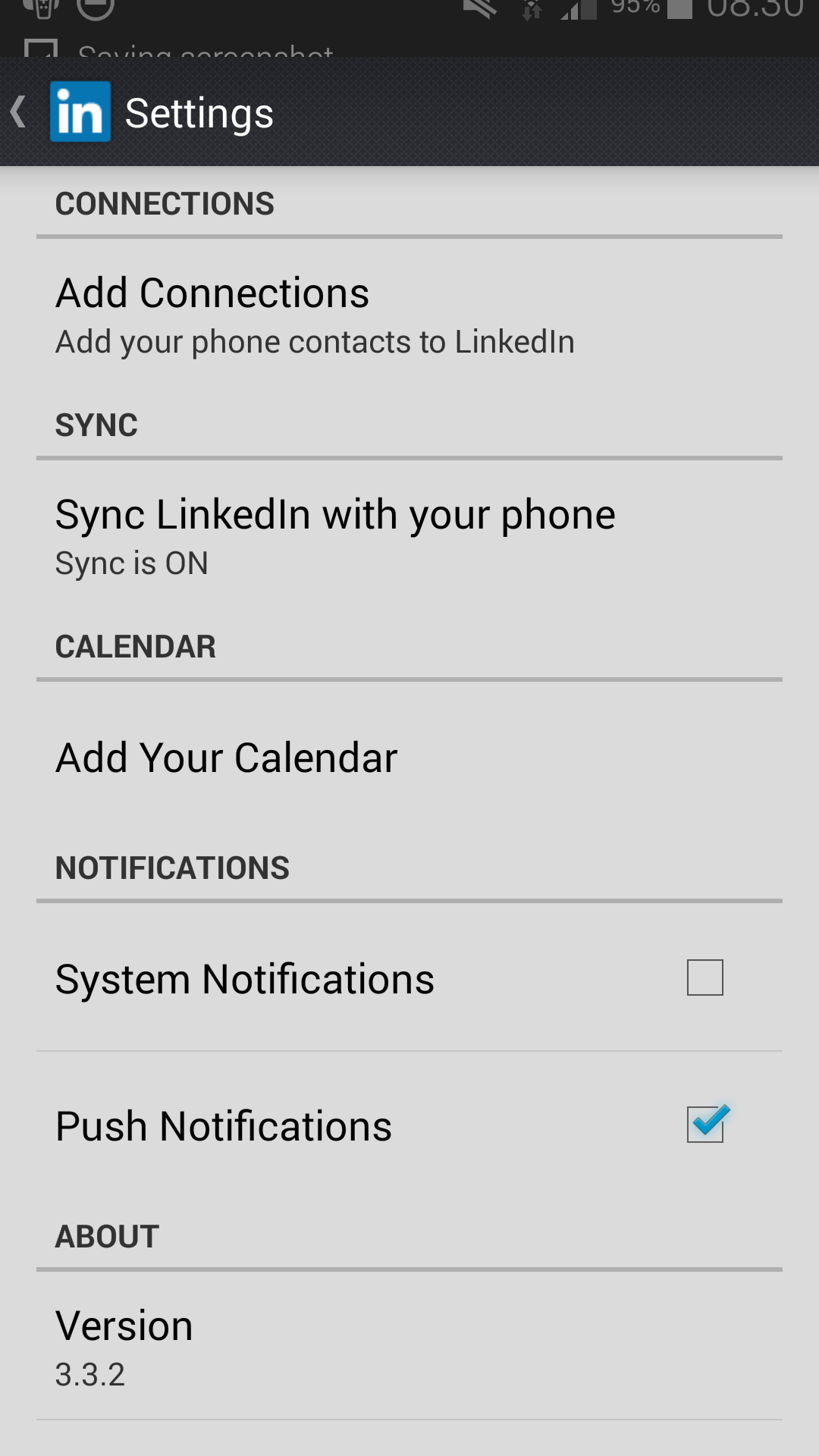 You can see above that my LinkedIn app is syncing with my phone. I’ve not yet found a way to get it to recognise my current rather than my first job. So I’ve switched off syncing. This is simple: open the LinkedIn app, and click the three dots on the top right of the screen to open the settings page. Click on the sync bar on the screen above, which will bring up the sync page, below.