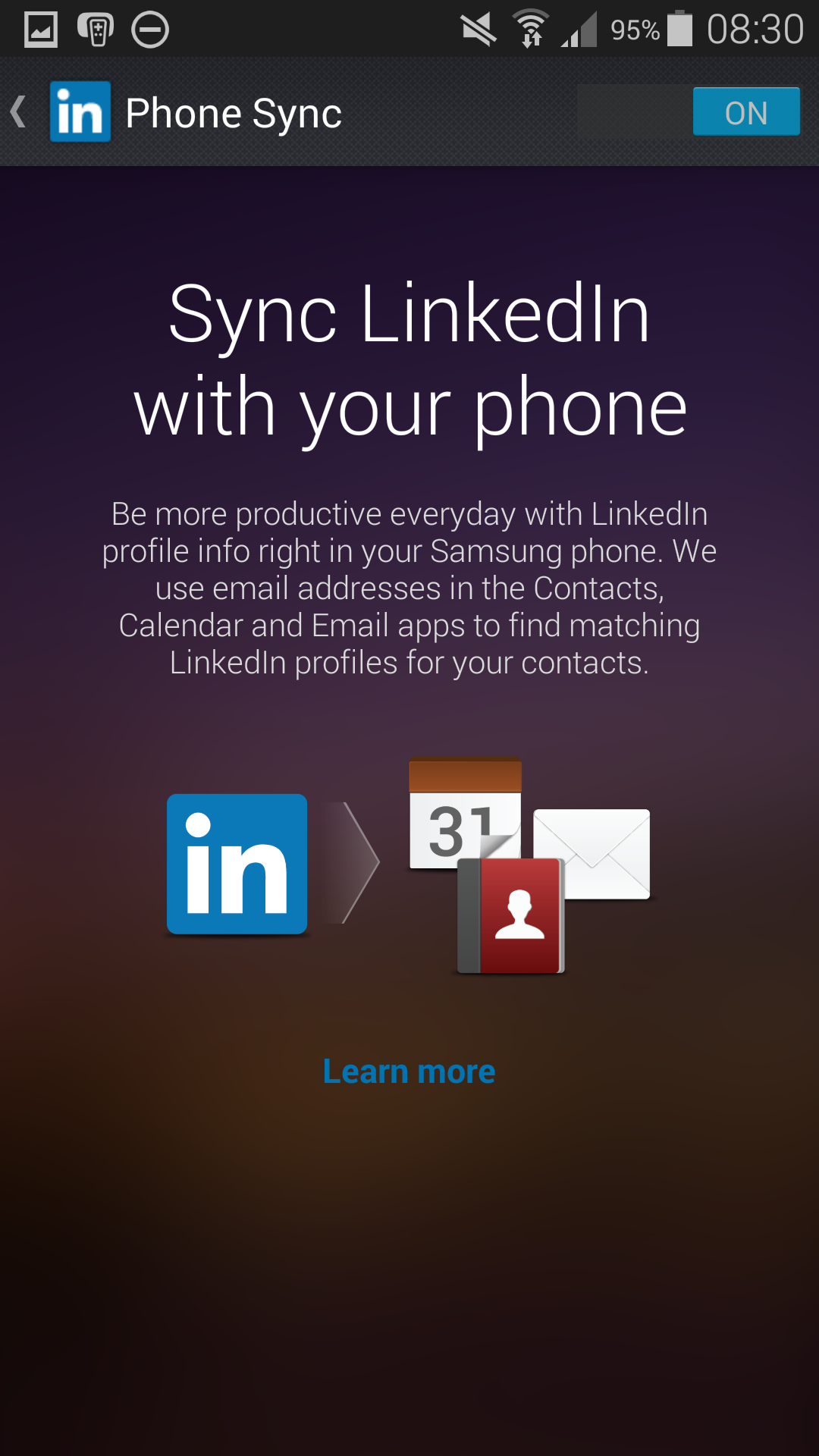 When you download the Android LinkedIn app, the S5 by default syncs your calendar with your profile. LinkedIn’s blog explains that this means you can find out about people who email and meet you.