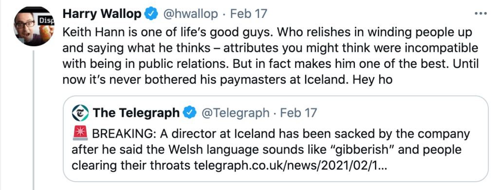 Companies are under constant scrutiny. Those of us in PR have to judge our comments, far more than was the case even a decade ago. None of us is perfect, and everyone should be allowed the occasional mistake. But we also need to take the advice that we’d give to executives. If you make a mistake, say sorry. Treat others how you’d want to be treated yourself. Applaud diversity. Be open minded about other opinions. While it is sad to see someone losing their job, if Keith Hann had been a good head of PR, he’d surely have told himself that insulting Wales was bad news.