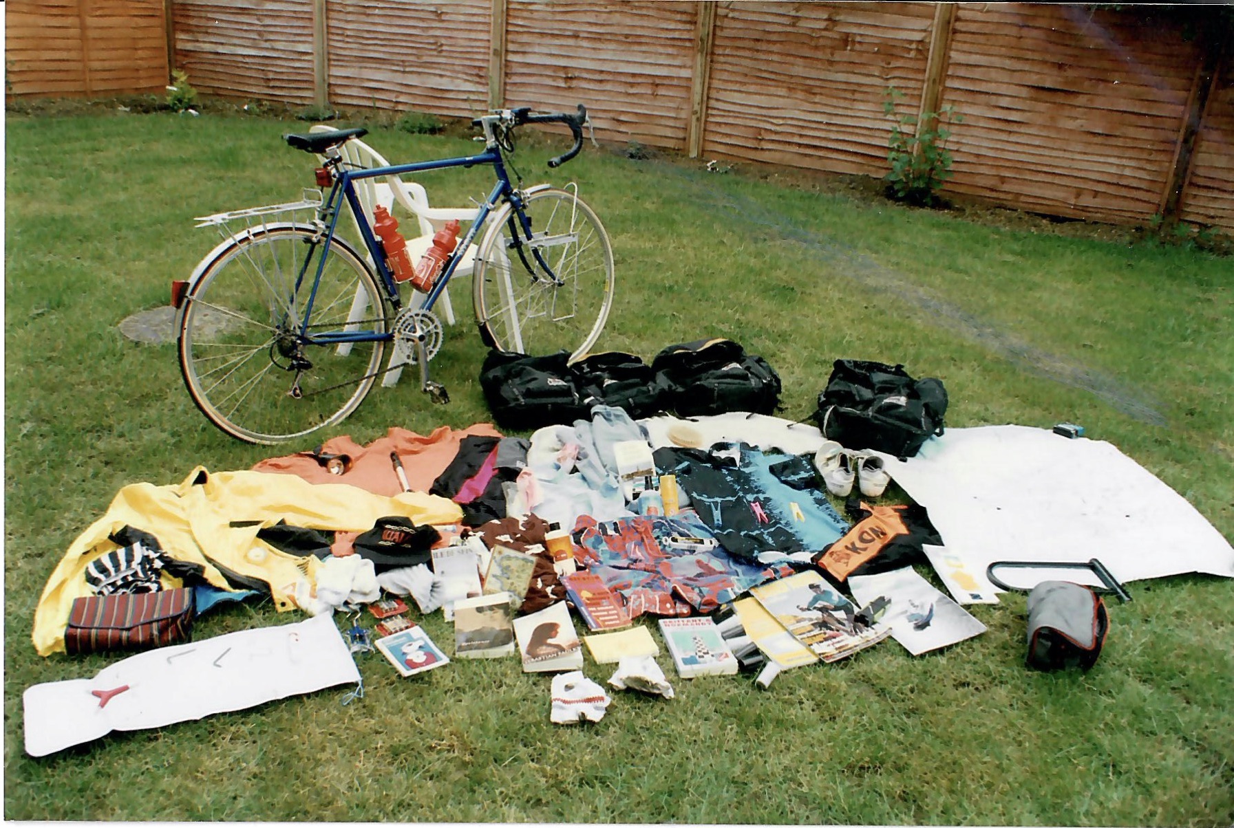 When I got home, I spread the contents of my panniers across my lawn in Wiltshire. Spot the notebook: it listed the contents of each bag! No Kindles in those days – and the paperback of Sebastian Faulk’s The Girl at the Lion d’Or was an appropriate choice for a holiday in France. (I finished it on the beach at Pentrez-Plage.) I enjoyed my days cycling with panniers, but 25 years on I prefer the bikepacking alternative.