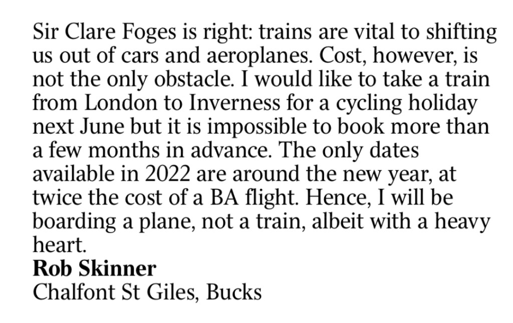 I was pleased to have a letter published about this in The Times today in response to Clare Foges’ article. I was chuffed to be published alongside the rail guru and historian Christian Wolmar.
