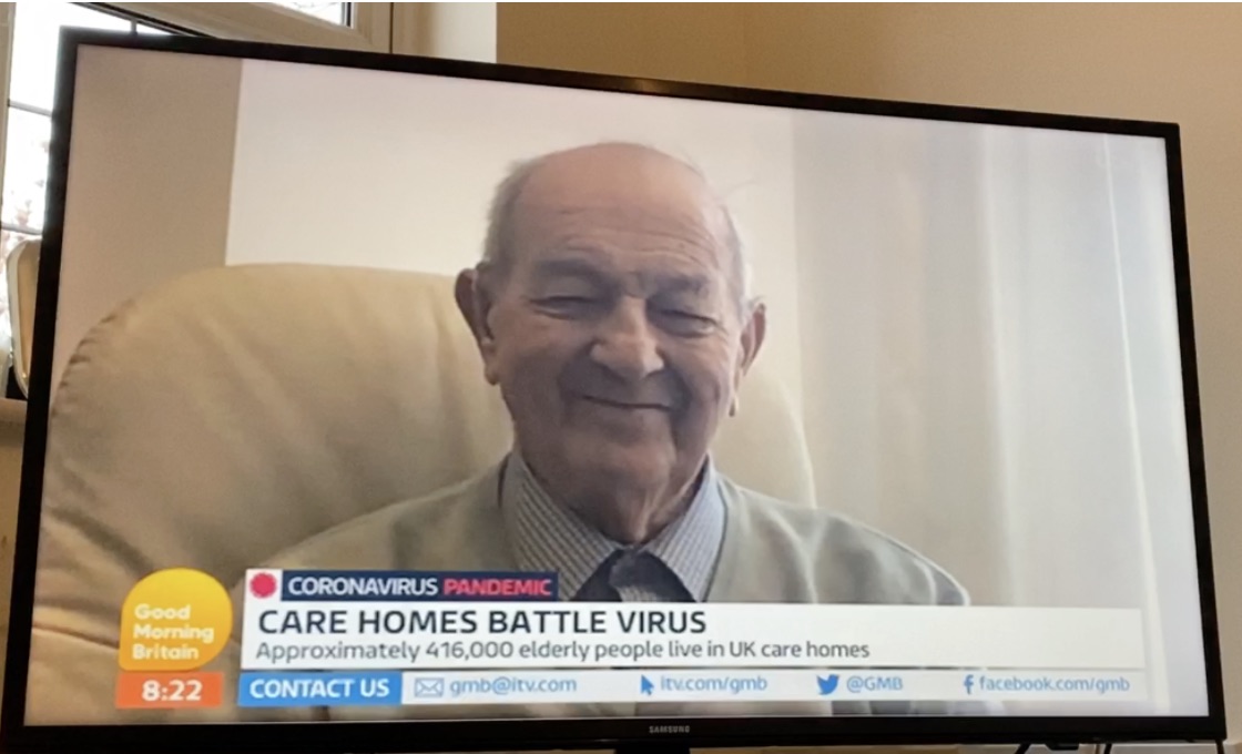 This was as close as I got to seeing my then 93 year old father for almost five months. Bob Skinner was interviewed by Good Morning Britain in April 2020 about life in a care home during the pandemic. We also had regular Zoom chats, but it wasn’t until July that we met face to face – at a socially distanced two metres. Our reunion was featured on Good Morning Britain.
