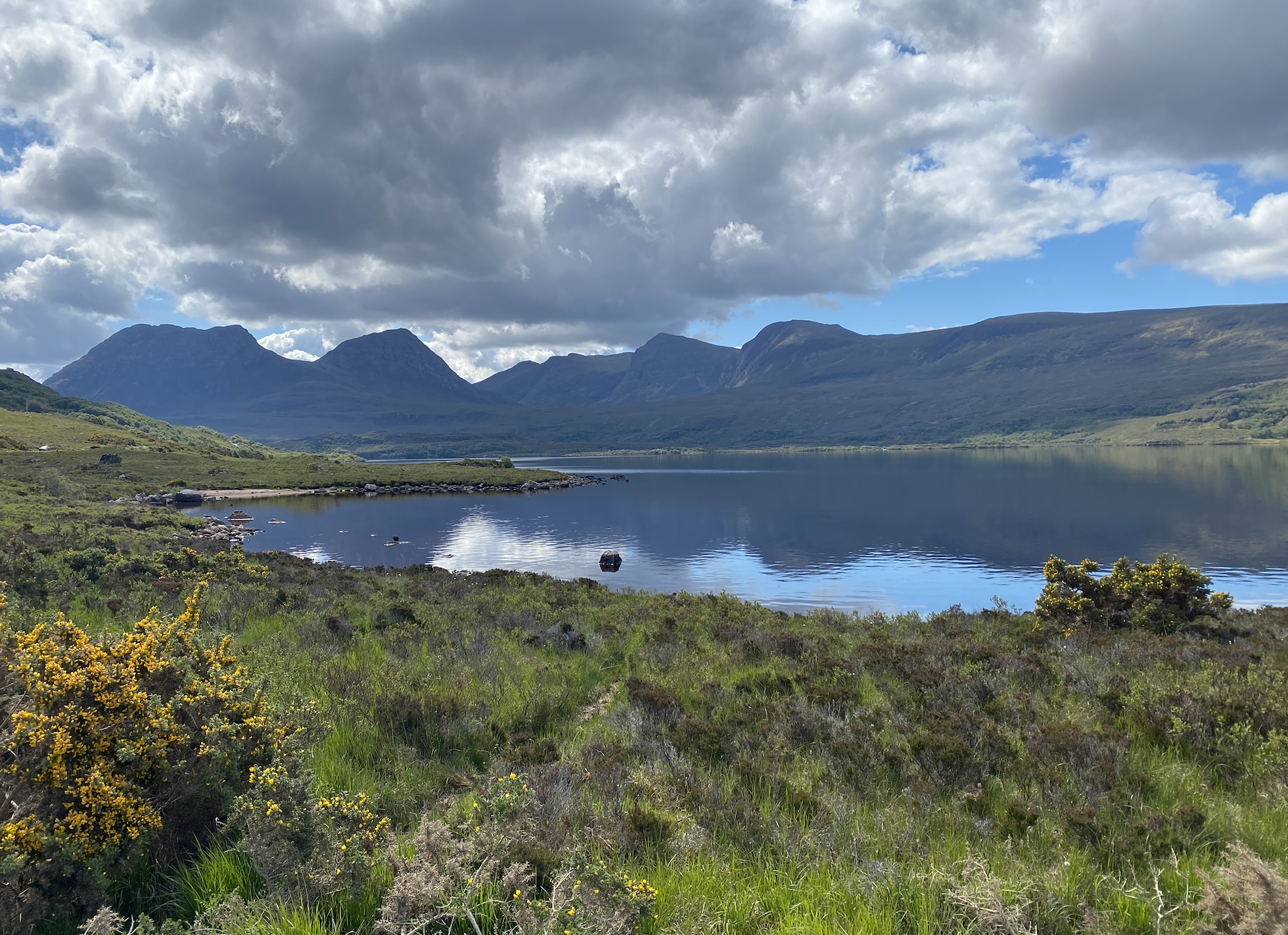 I was cursing my decision not to take a rest day in Ullapool. After nine miles and 1,000 feet of climbing I envied the wisdom of those taking a lazy, late breakfast, enjoying a good book or taking a boat trip. Then I glanced and saw the mountains, blue sky and brilliant clouds reflected in the still waters of Loch Cùl Dromannan. I gasped in wonder, and slowed the bike to a stop to drink in the vista and take the photo above.