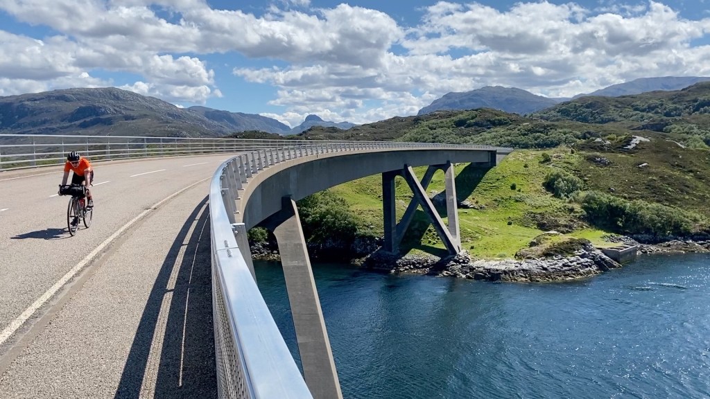 As I departed the cafe, I found it a struggle to make progress because of a combination of incline and headwind. But before long I was crossing Kylesku bridge, which looked as stunning in reality as in photos. Opened in 1984, it features V-shaped piers and a gracefully curving deck to fit the landscape. It is now officially called Drochaid a’ Chaolais Chumhaing, its name in Gaelic.