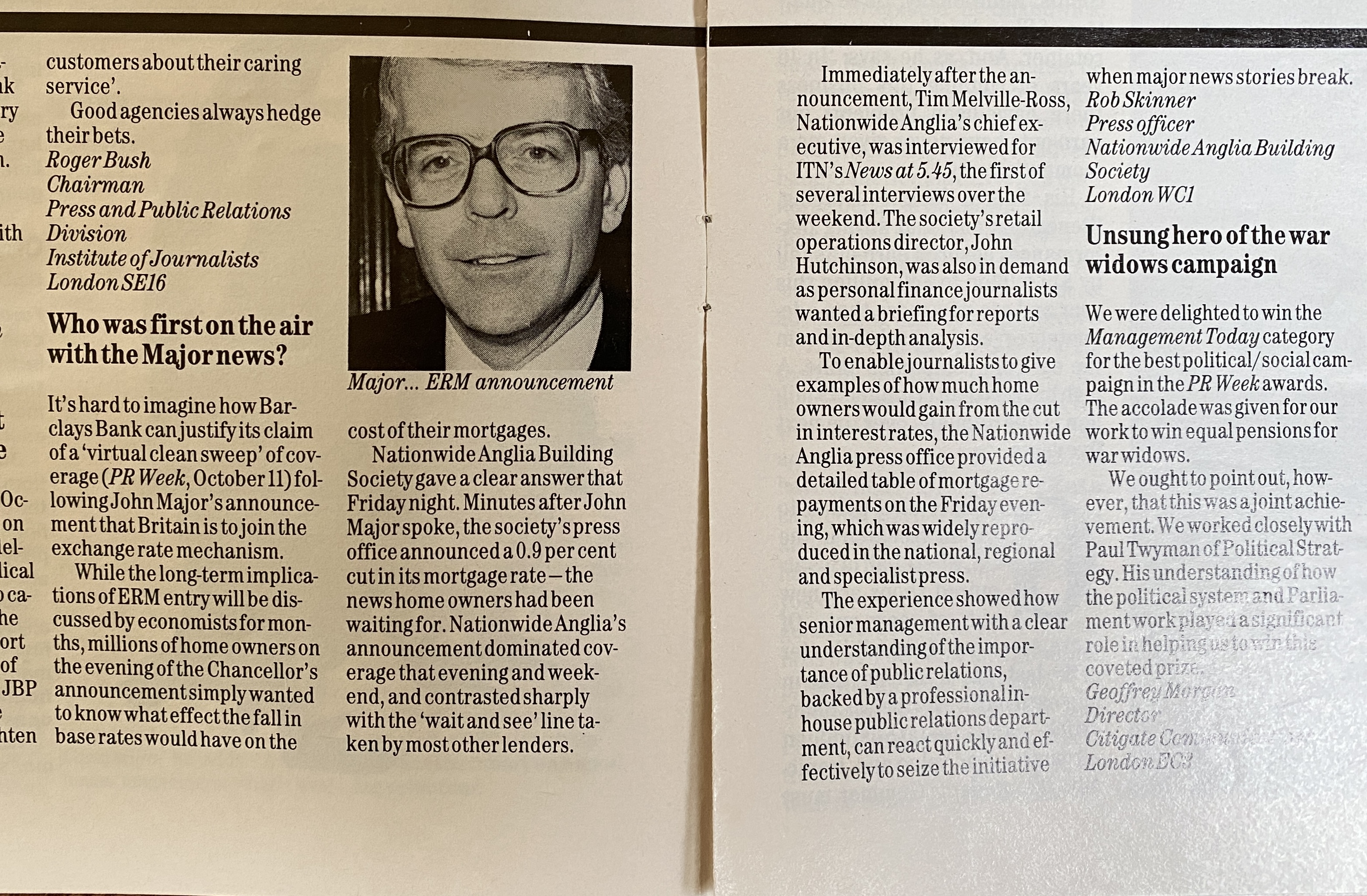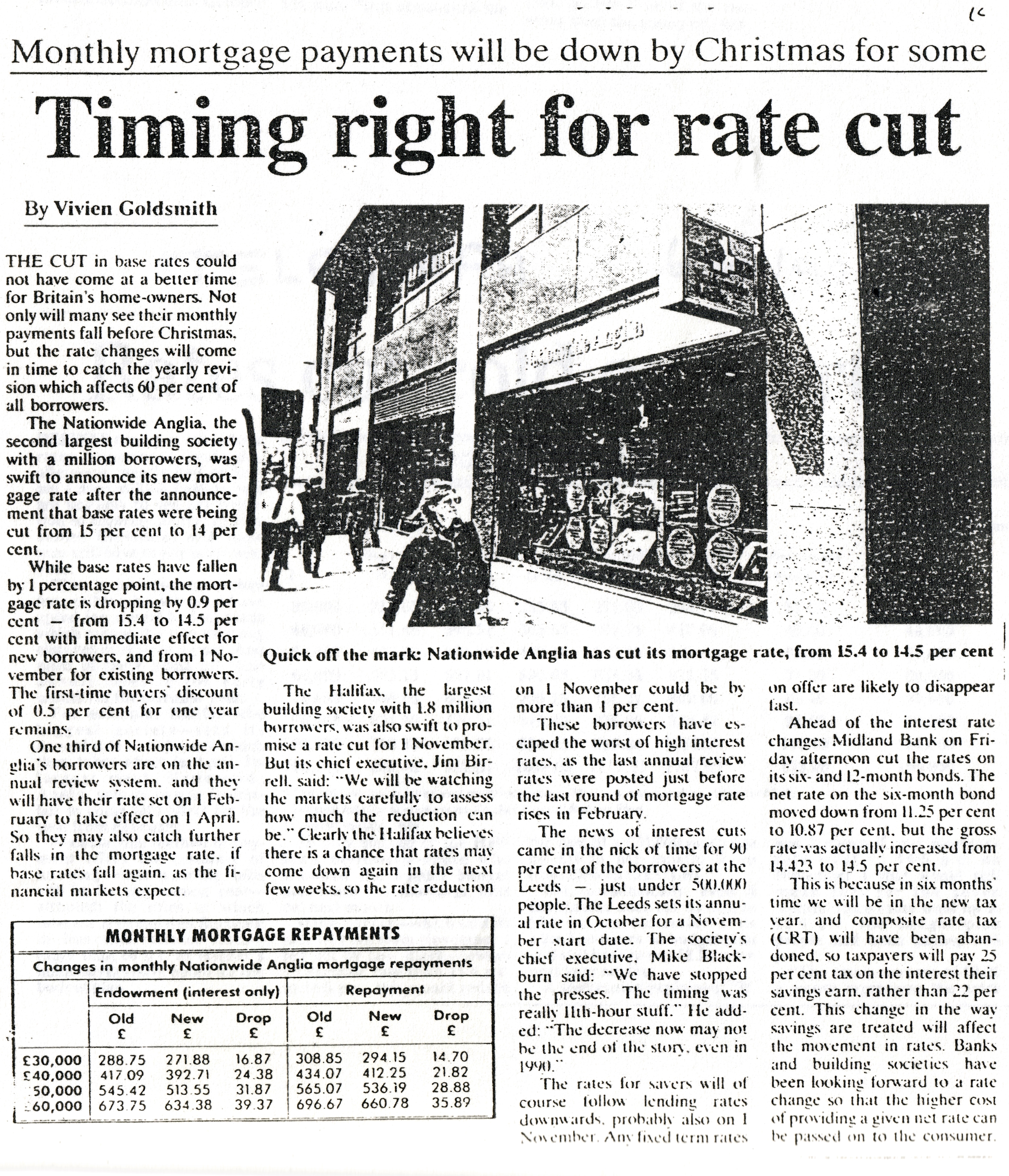 I started typing the news release. But I never got the chance to finish it as the phones were going crazy as the BBC, ITV and the national press wanted to know if Nationwide was going to be the first to cut rates. Instead, I gave the details of the rate cut to the media and arranged for Tim to be interviewed on ITV’s evening news and other bulletins. I also arranged filming at a Nationwide estate agency branch, and provided examples of the saving for typical borrowers. (Strikingly, the biggest mortgage I quoted for was £60,000 – close to the average price of a house in the UK that year.)