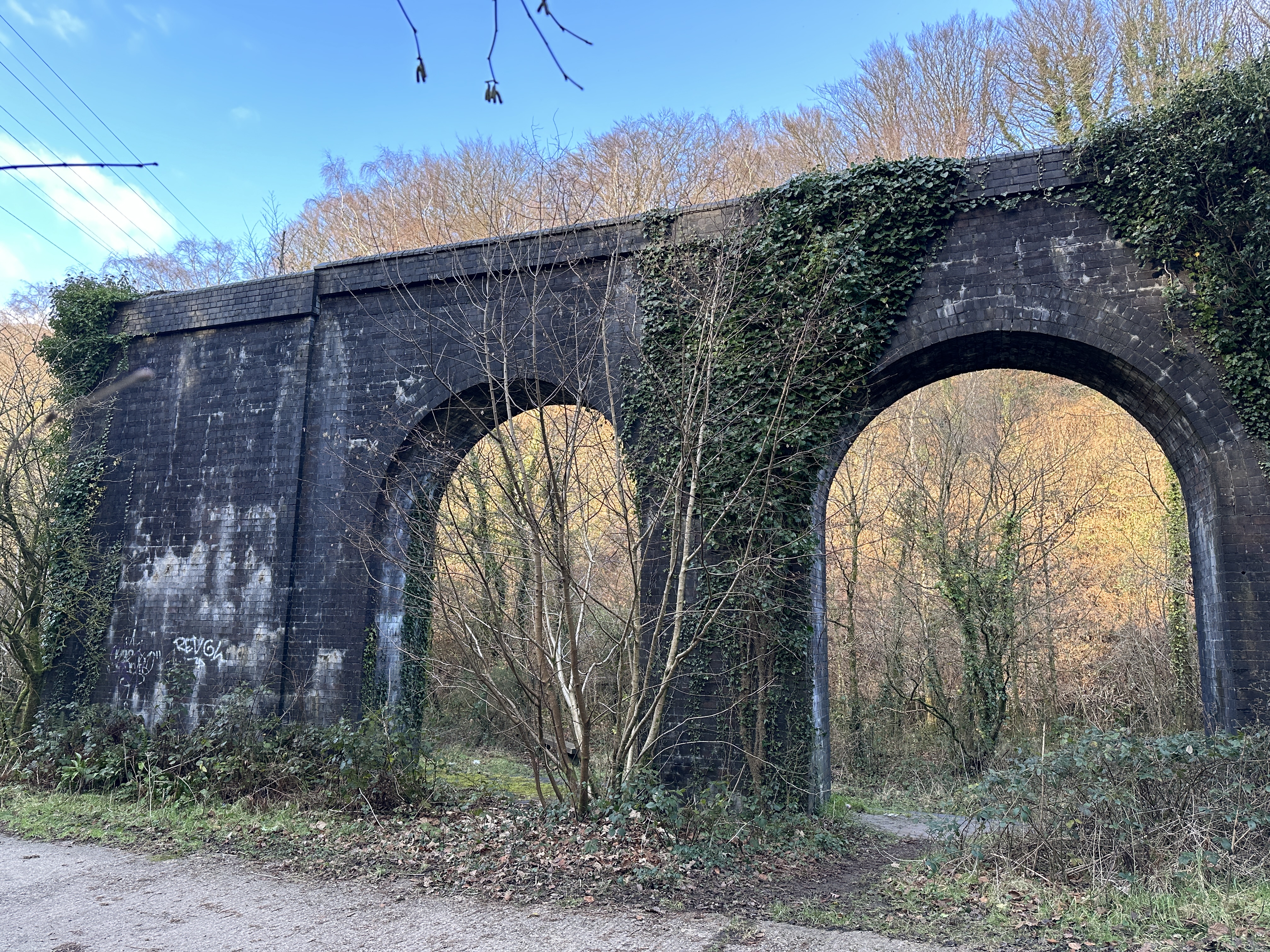 I took my original photos of Penrhos Junctions from a handsome road bridge that originally carried the road up over the mountain to Rhiwbina and Tongwynlais. I thought the structure had been swept away when a new route for the A469 was created – it was impossible to see the bridge from Google Maps or Google Earth. Yet as I walked back to the car I turned left over a track – and Owen pointed out the parapets either side. We were standing on the old crossing! It was far narrower than I remembered, and the setting had been totally reclaimed by nature.