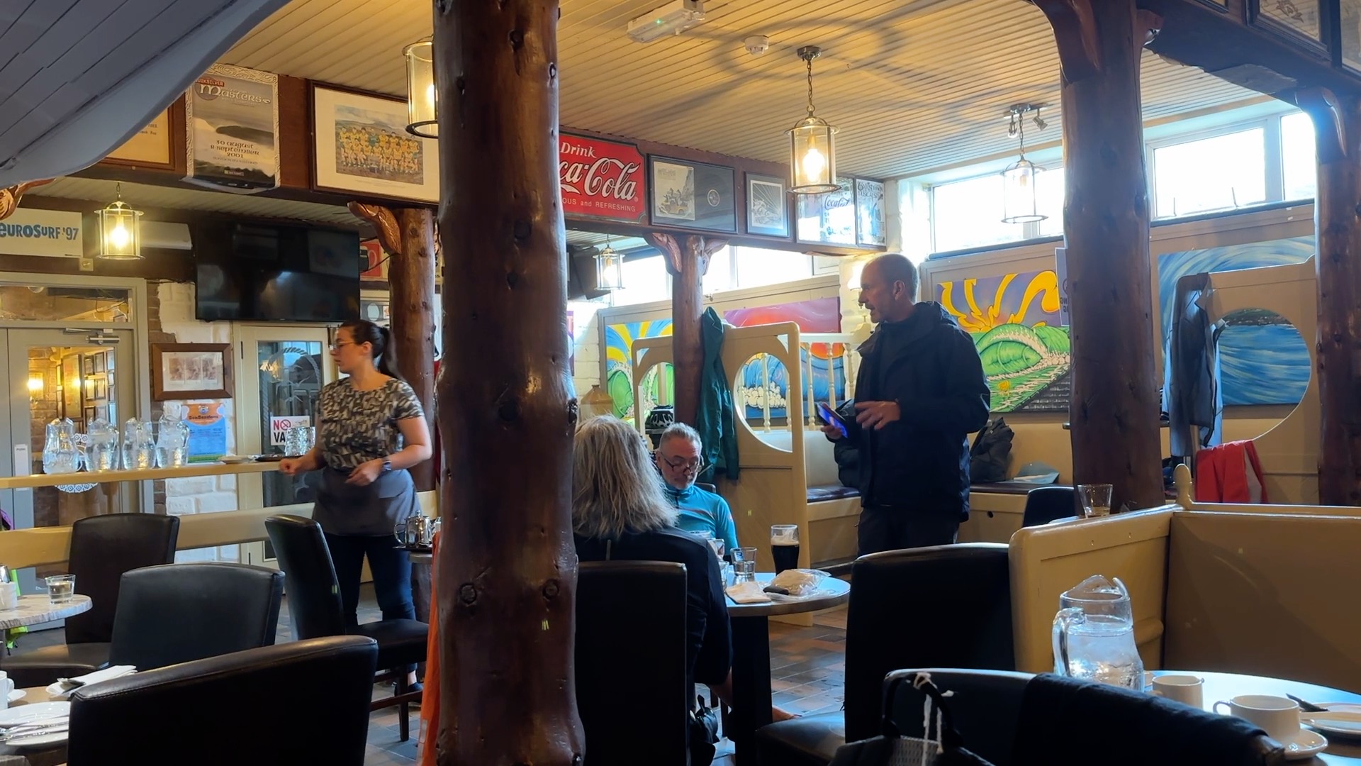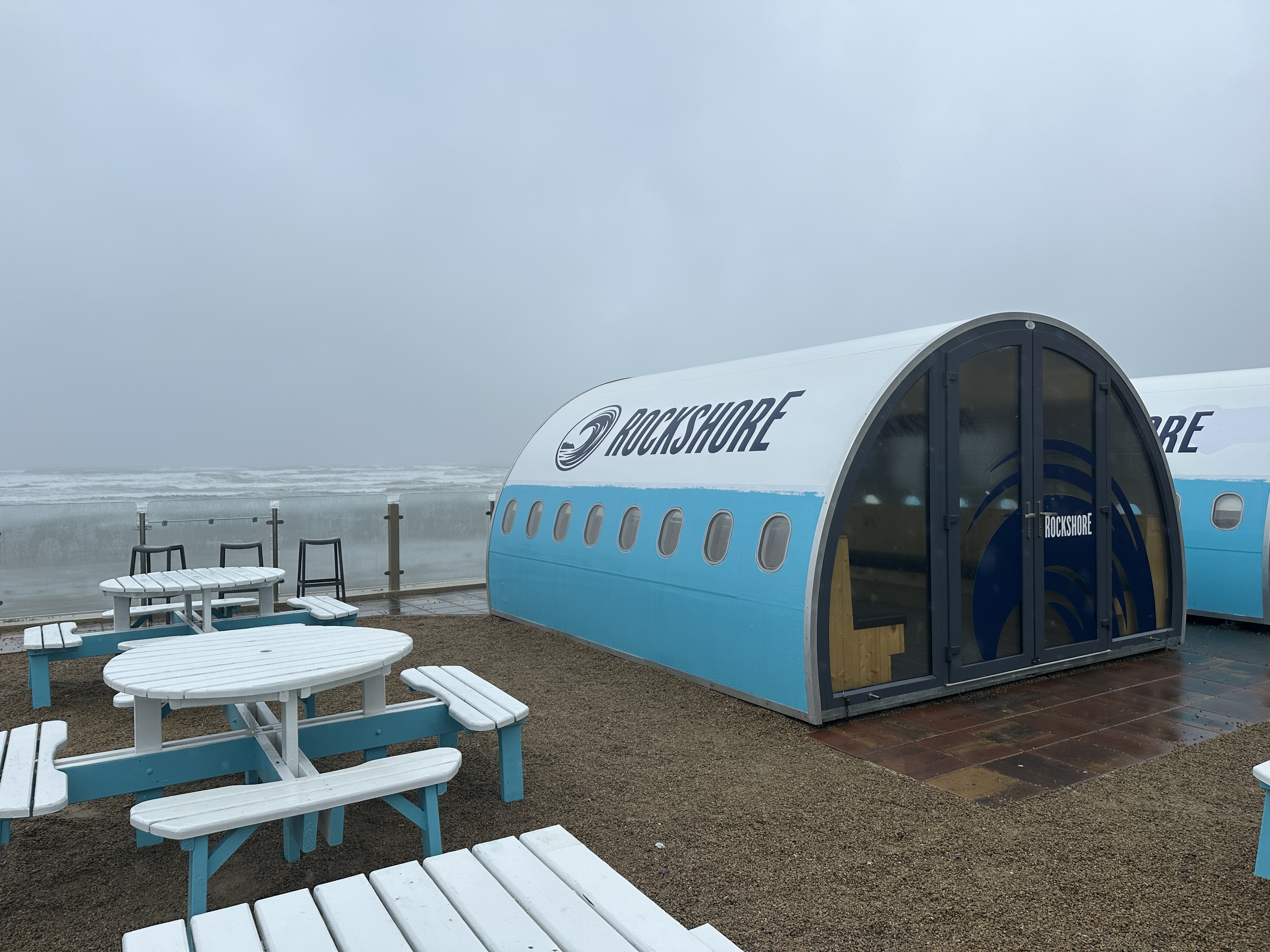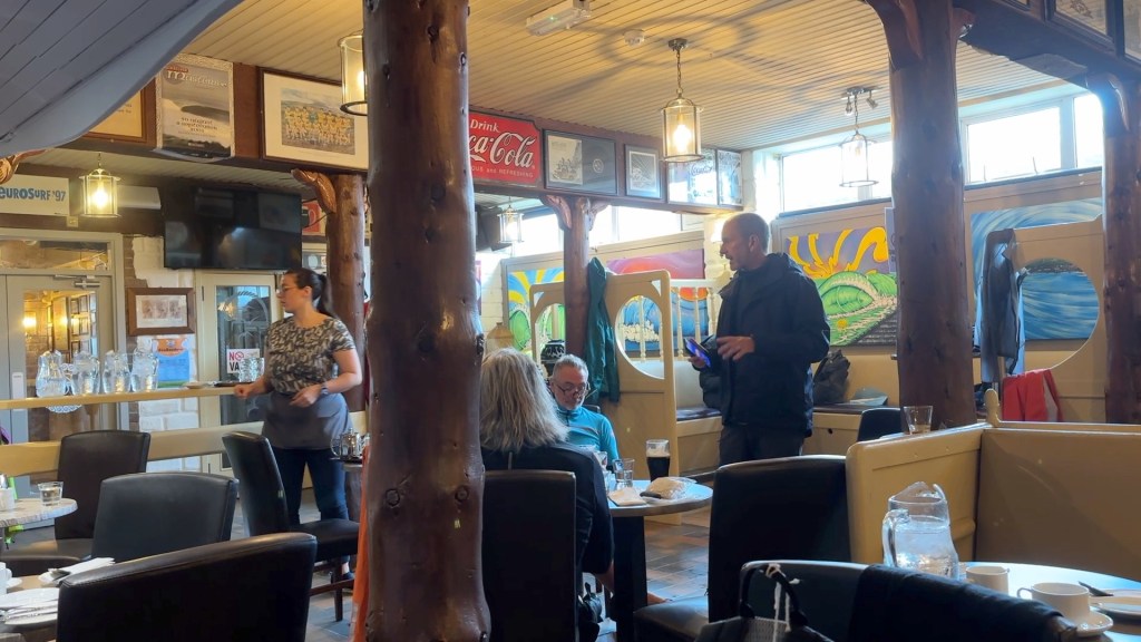 It was impossible to imagine cycling along the beach and even the surfers were nowhere to be seen – not even in the Surfers’ Bar at the hotel, where I enjoyed coffee and sandwiches as we sheltered. I had learned my lesson from being so cold at lunch on day three, carrying my down cycling jacket in my saddle bag. I popped it on after removing me soaking wet cycling jersey. Ironically I bought the jacket to keep me warm at 2am on London Wales London, but never needed it then, unlike at 12pm in Ireland in late June!