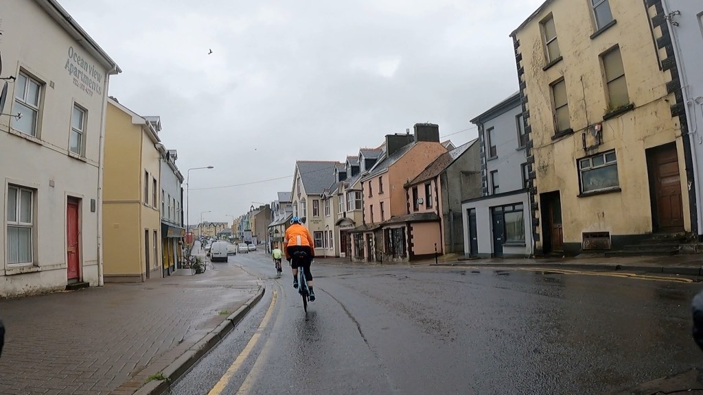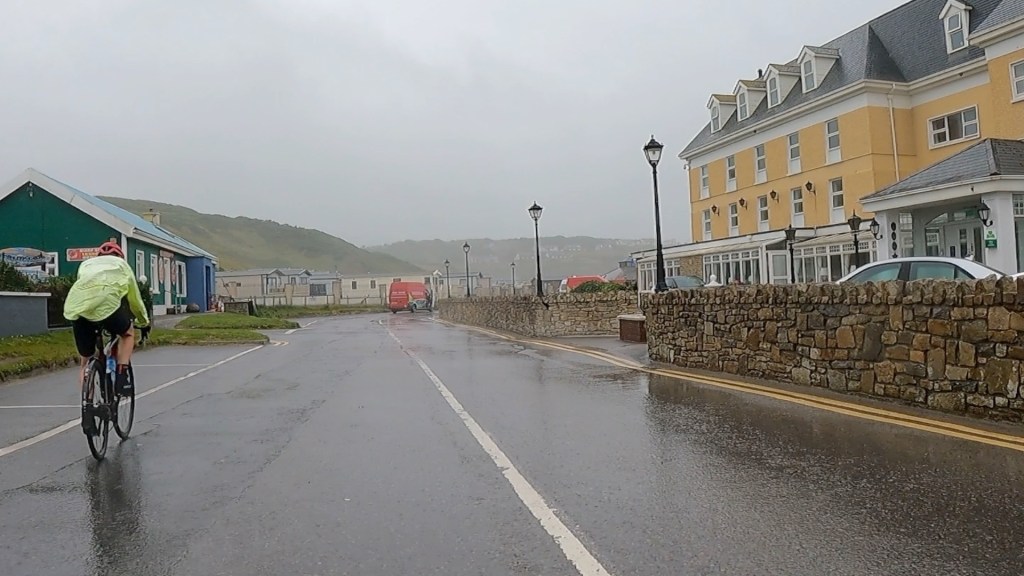 We cycled through Bundoran, a sad-looking seaside town, seen above. I shouldn’t be too harsh – I first visited Bondi Beach in Australia on a similar wet day in 2000 and thought it looked like Barry Island in Wales in winter. I stopped briefly to take some video so today’s highlights video would give a fair representation of our experience.