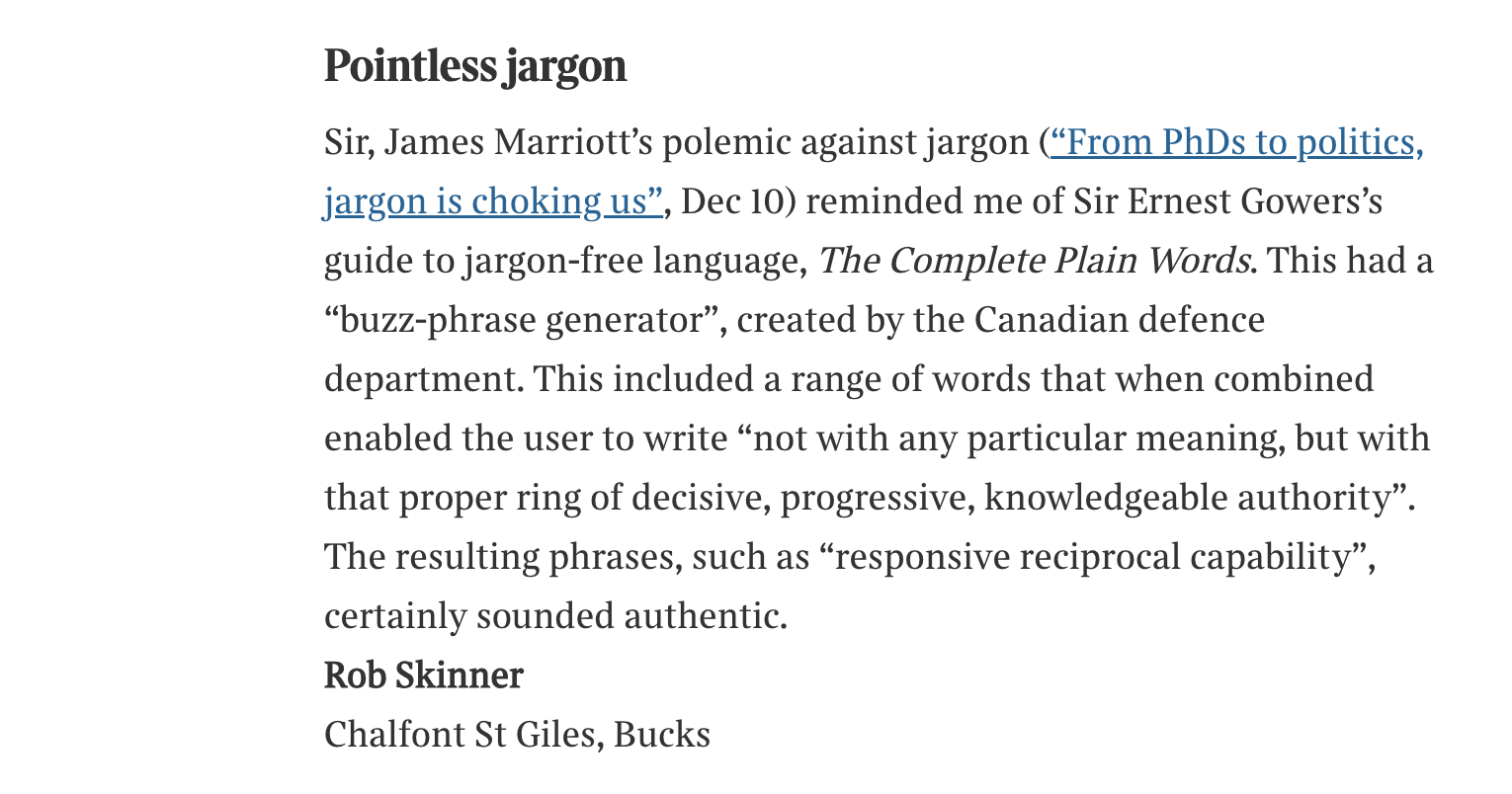 James Marriott, whose article about jargon inspired my letter, was railing especially against the way jargon creates an exclusive club. Those who do not understand it are excluded. It also places a more subtle barrier, as recipients struggle to decode the meaning. As a result, jargon users are likely to spend more time dealing with an enquiry than if they’d explained themselves clearly in the first place.