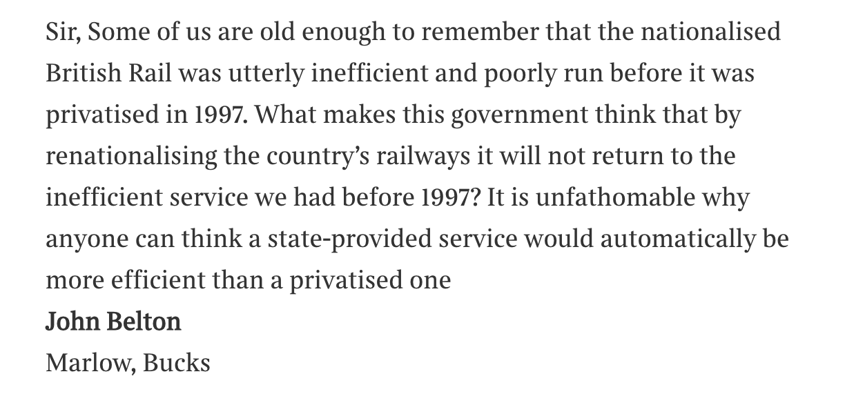 I sighed when I read this letter in The Times. Mr Belton is clearly good at a pithy rant. But his verdict against British Rail is wearily familiar and unbalanced. At least he didn’t mention the sandwiches, unlike a follow up correspondent who wrote a fair defence of the old nationalised rail network, yet fell for the sandwich myth: