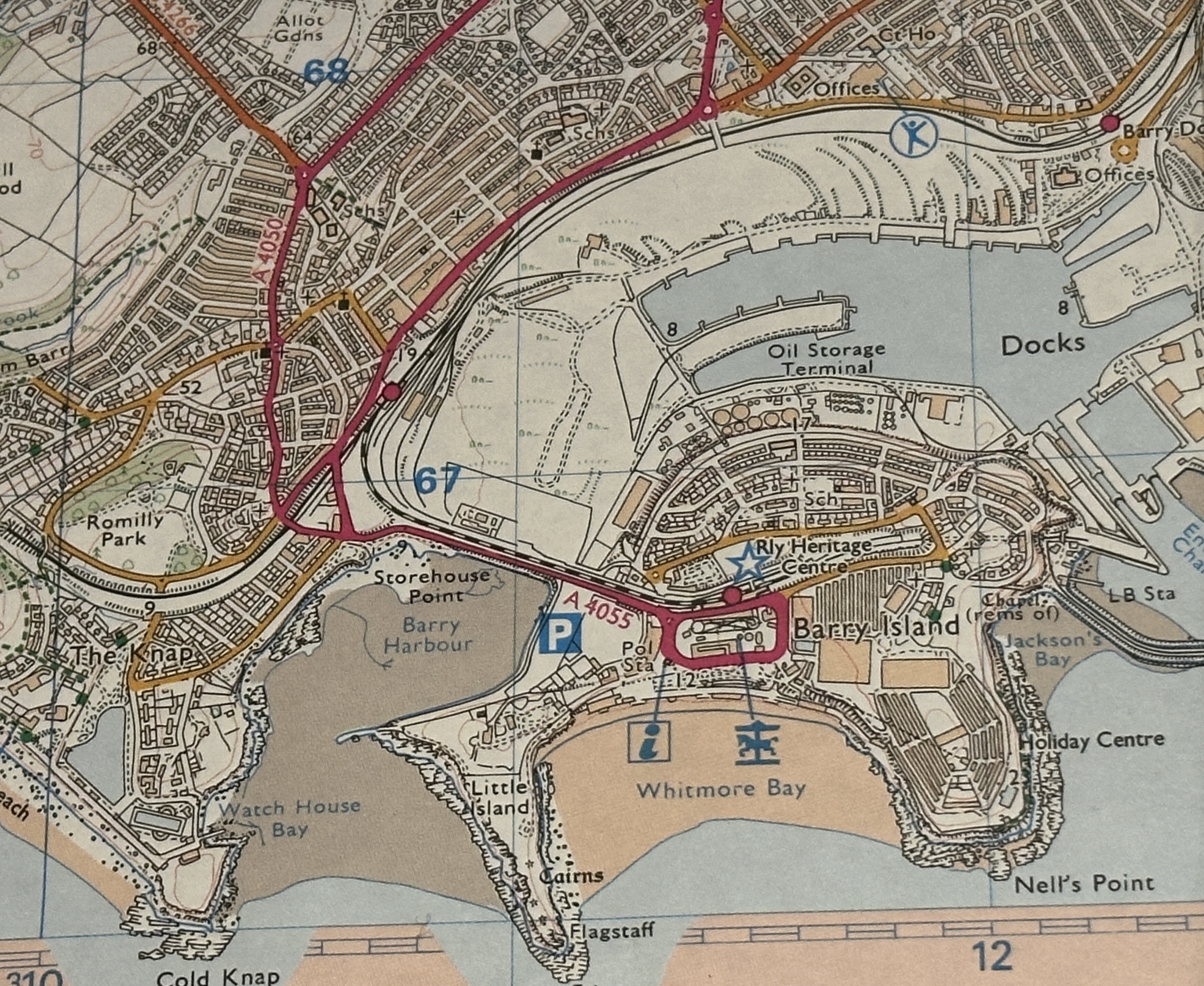 This 1985 photo shows the town of Barry behind one of Dai Woodham’s rusting steam engines. You can see how derelict this part of Barry was then – yet a few decades earlier this would have been a web of railway sidings near Barry docks and Island. Today, the landscape has been transformed, with the huge, empty space between Barry Island and Barry Town filled with new houses and supermarkets. Much as I miss the chance to clamber over old steam engines, I have to admit today’s Barry is more attractive. The contrasting maps below (1998, left, and 2024, right) graphically show how the area has changed – just look at that empty land north of the causeway to the island in the 1998 version.