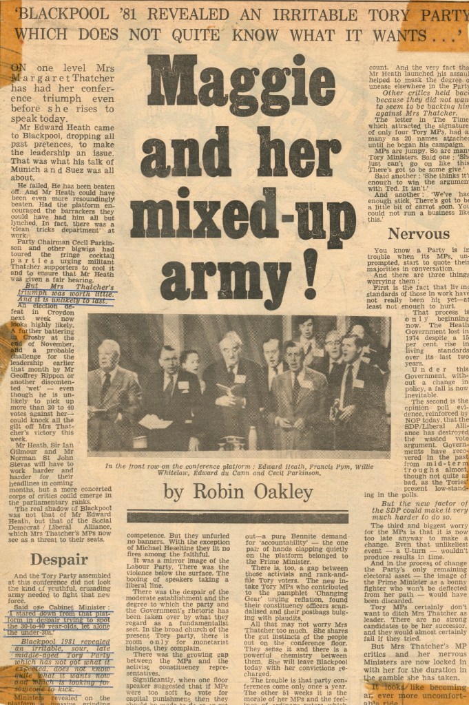 Above: the Tory-supporting Daily Mail reveals the troubled state of Thatcher’s party, 1981