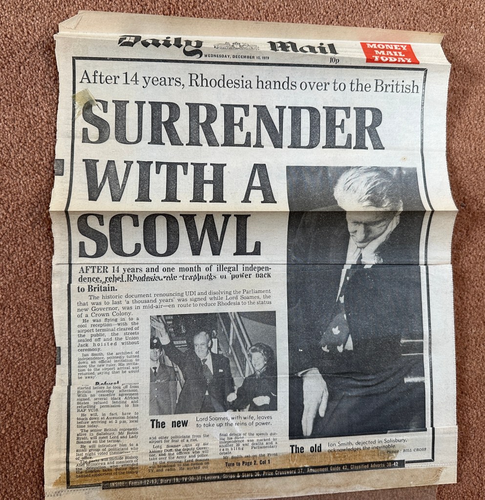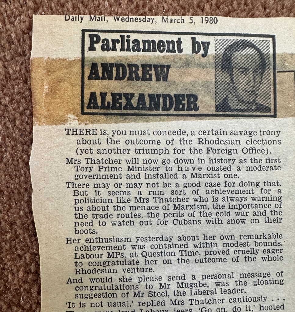 After Margaret Thatcher became prime minister in May 1979, my scrapbook became dominated by cuttings about politics, and the tumultuous events of her early years in power. I was studying for my O levels (the predecessor of today’s GCSEs) and intrigued by the coincidence of Rhodesia briefly becoming a British colony again at the end of 1979. (At the time we were learning about British colonial policy of the 19th century, including the dubious exploits of Cecil Rhodes, the creator of that country.) Back in 1965, Rhodesia’s white leader Ian Smith had declared independence unilaterally to avoid Britain giving the country’s majority black citizens the vote in an independent nation. After 14 years of isolation and civil war, Rhodesia threw in the towel and the crown colony of Southern Rhodesia was briefly reborn to pave the way for free elections and legitimate independence. Churchill’s son in law Christopher Soames flew in as governor.