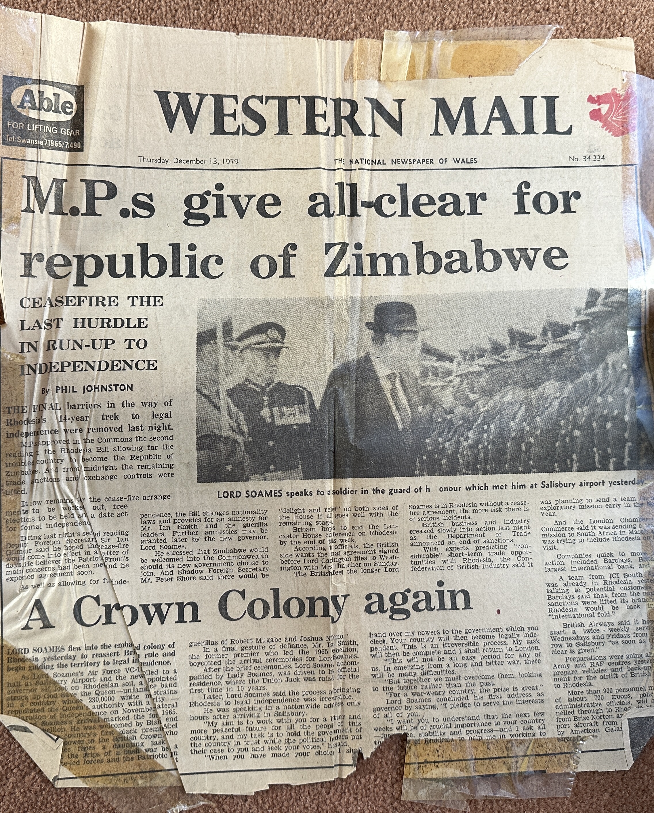 After Margaret Thatcher became prime minister in May 1979, my scrapbook became dominated by cuttings about politics, and the tumultuous events of her early years in power. I was studying for my O levels (the predecessor of today’s GCSEs) and intrigued by the coincidence of Rhodesia briefly becoming a British colony again at the end of 1979. (At the time we were learning about British colonial policy of the 19th century, including the dubious exploits of Cecil Rhodes, the creator of that country.) Back in 1965, Rhodesia’s white leader Ian Smith had declared independence unilaterally to avoid Britain giving the country’s majority black citizens the vote in an independent nation. After 14 years of isolation and civil war, Rhodesia threw in the towel and the crown colony of Southern Rhodesia was briefly reborn to pave the way for free elections and legitimate independence. Churchill’s son in law Christopher Soames flew in as governor.