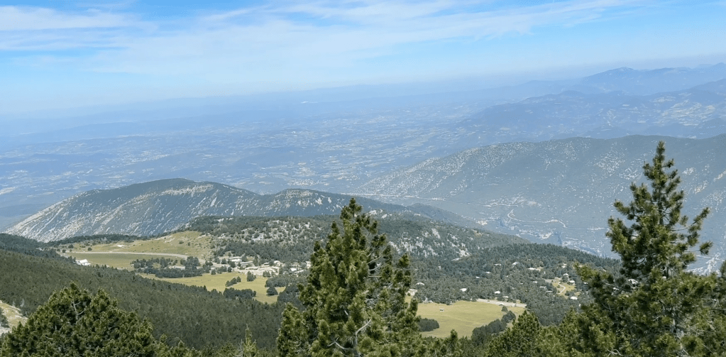 We paused on the lower of those hairpins to take in the views across Provence towards the Alps. Ventoux is unusual as it stands alone rather than as one of a range of mountains as in the Alps, Massif Central or Pyrenees.