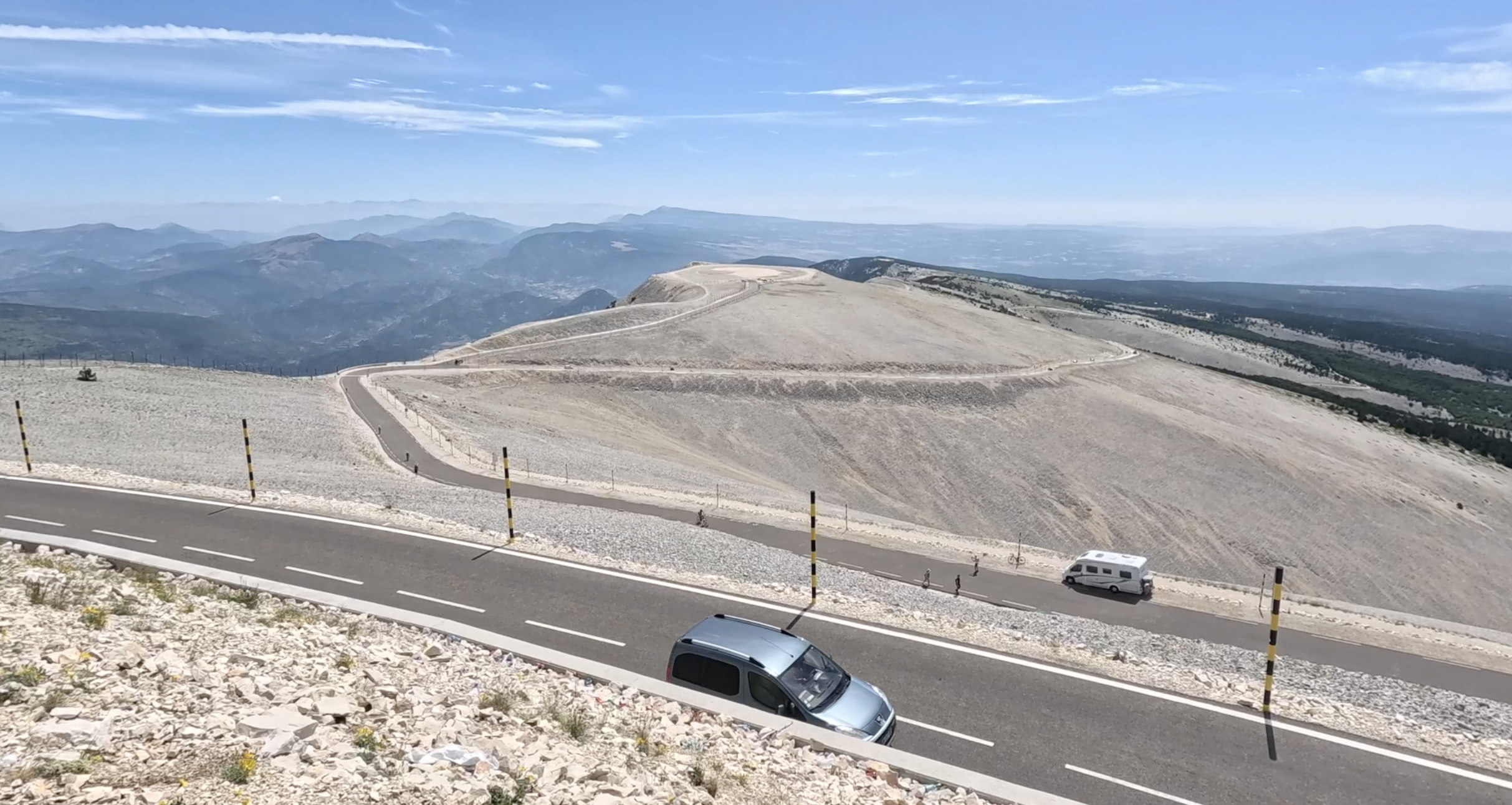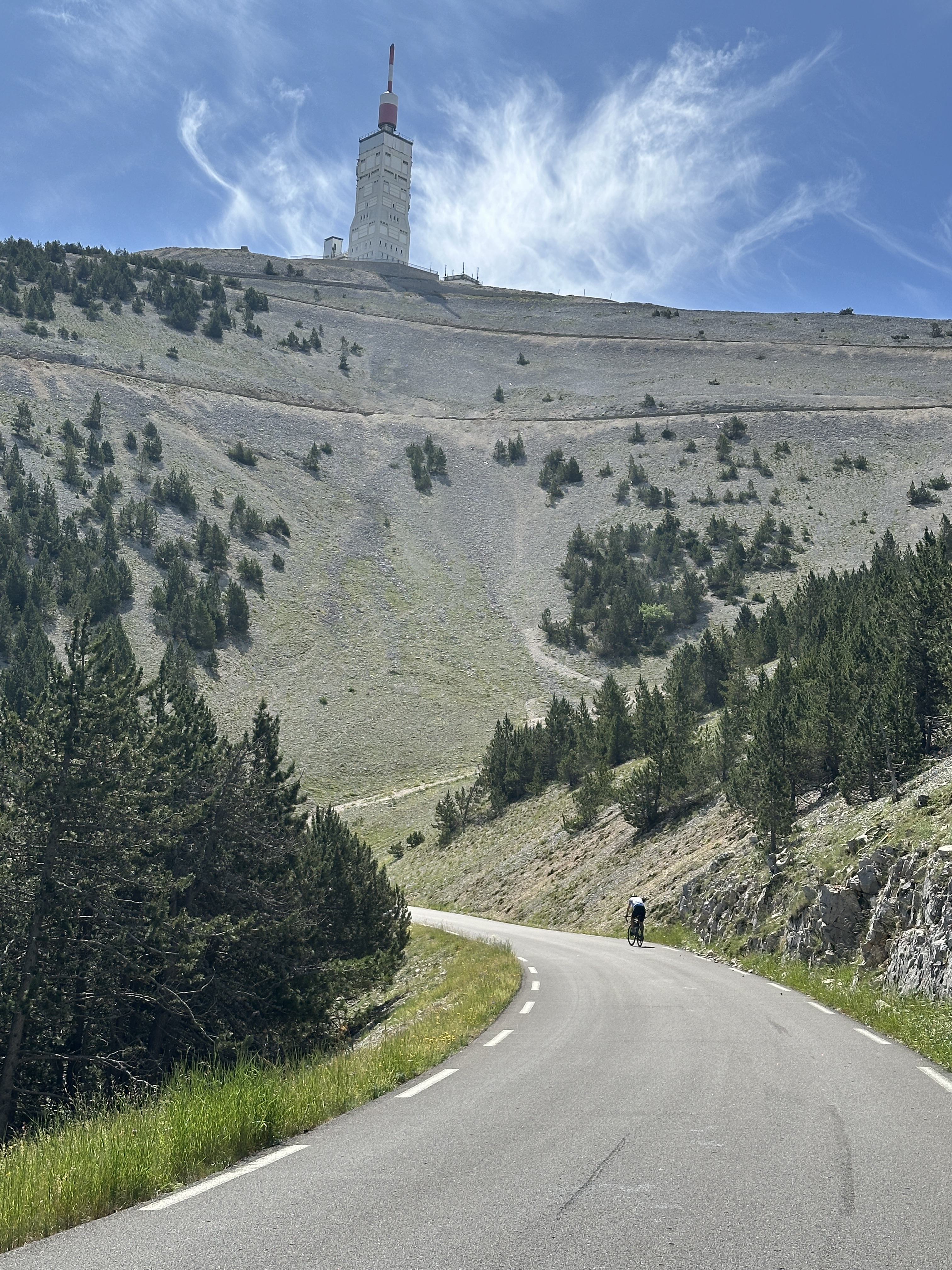 I was so glad to be cycling with Jim on the hardest parts of the ride. I indulged my usual technique for tacking long, steep climbs: ride short sections and pause, repeatedly. No coach would ever recommend this approach, but it’s got me up countless ascents including Teide in Teneriffe. Jim, by contrast, set his cadence and kept going. On the Highland 500 tour in 2022 fellow rider Angela contrasted our techniques as those of the hare and the tortoise. This hare made it up Ventoux! As did all the tortoises, as well as the faster animals…