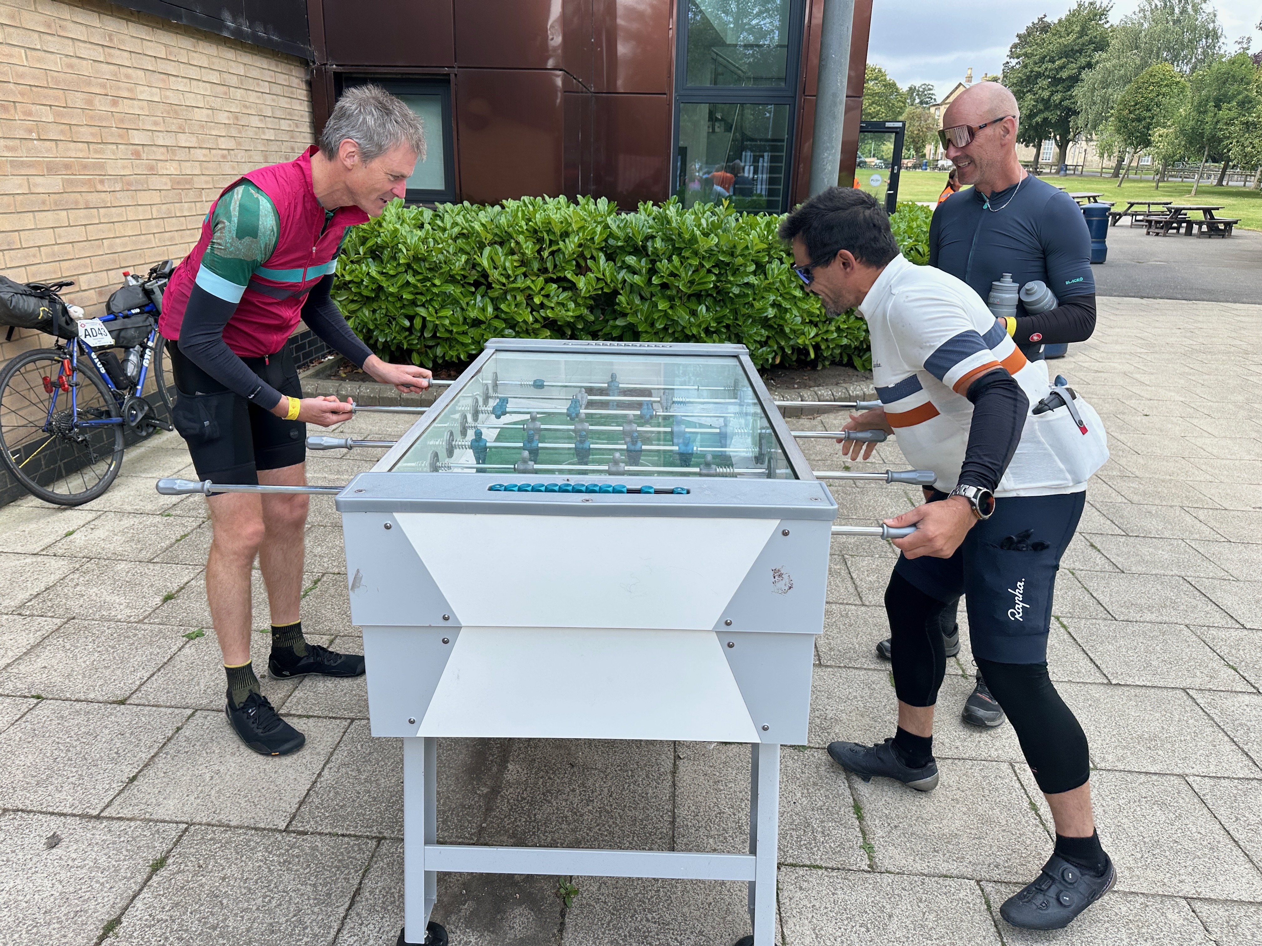 My favourite day on LEL was day three, on the way south, from Malton to Boston. It was still very windy, but dry and sunny, and most riders seemed liberated by no longer being slaves to time. In the picturesque dry valleys of the Yorkshire Wolds, we stopped to take photos, while some took part in highly competitive game of table football outside Hessle control. Liam FitzPatrick, who was leading LEL comms and social media, had talked about making this day the most memorable day in LEL history. I will certainly never forget it. I shared various photos and videos with the LEL comms and social team, including the two above, which captured the essence of the experience.