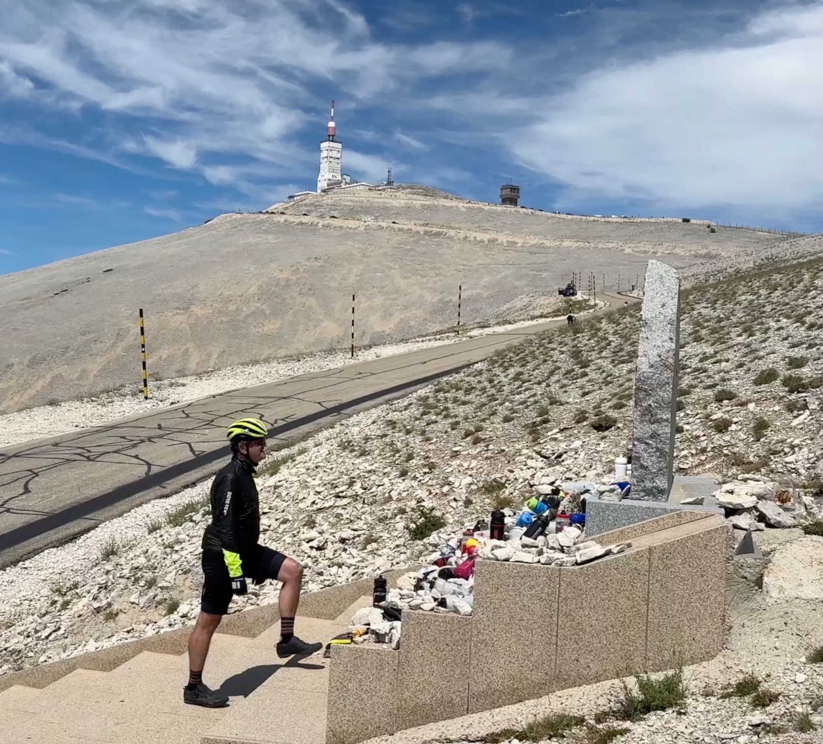 This was my greatest cycling climb. A chance to follow in the wheels of Tour de France greats, and to pay homage to Tom Simpson, the British rider who tragically died near the summit during the 1967 Tour. It was as tough as I expected: a 21 kilometre, 1,700 metre climb. The photo on the left above gives an idea of the incline – and there was a steeper section of 10 percent for over four kilometres. (A few weeks later, I cycled up a fiendishly steep ramp on holiday in Cornwall and marvelled that I’d managed four kilometres at the same steepness climbing Ventoux.)