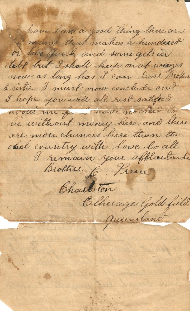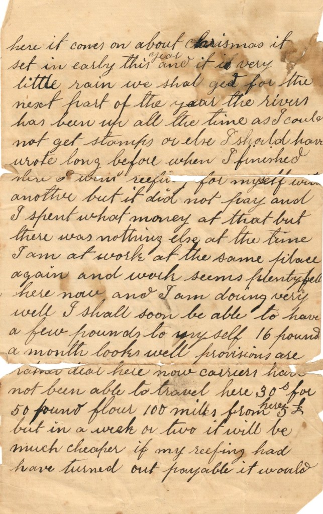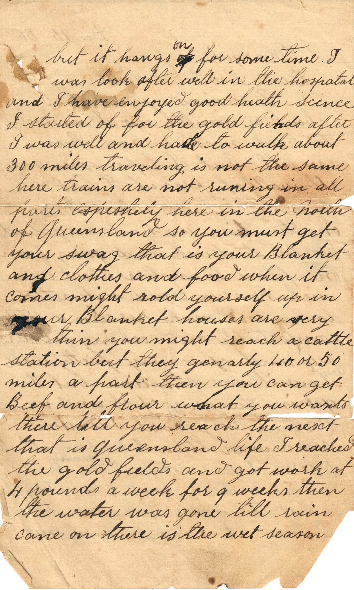 It’s clear from the letter what a hard life awaited those who travelled to Queensland in the hope of making their fortune. The writer mentioned walking 300 miles because of the lack of railways in that part of Queensland, and also says how expensive provisions were, saying that 50 pounds of flour cost 30 shillings. (As a rough guide, that’s equivalent to around £220 in today’s money, which is a contrast with today’s price of around £20 for the same amount of flour.)