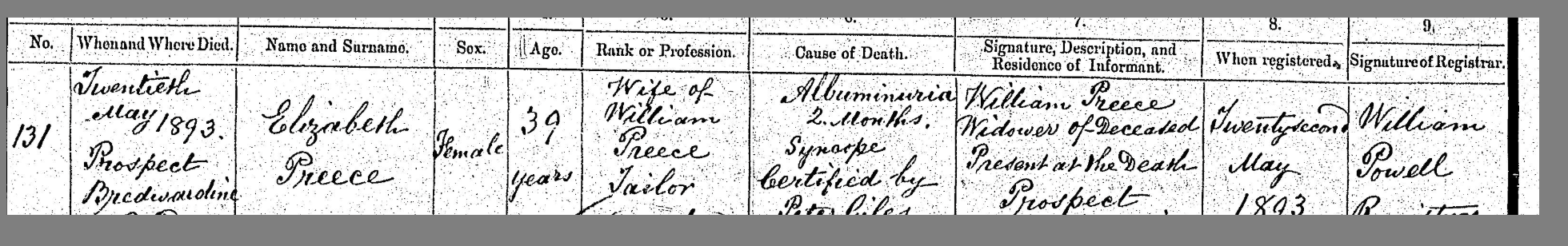 Within a few minutes I’d downloaded from the General Register Office a digital copy of Elizabeth’s death certificate, above, which showed that she died of albuminuria, which is associated with kidney damage. The document showed that her husband, William Preece (senior), was with her when she died.