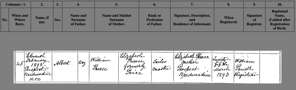 My next task was to find the birth certificate of my grandfather, Albert Preece – known to me as Grampy. This confirmed that his parents were Elizabeth and William, and, very poignantly, that Grampy was born three months before his mother died. I wonder if his mother’s illness was a result of a difficult pregnancy – far more dangerous 133 years ago than now? However, there was one mystery: Elizabeth’s maiden name was given as Price, not Williams. Was Elizabeth Williams another relative? Incidentally, the surnames Preece and Price are both anglicised versions of the traditional Welsh name ap Rhys (son of Rhys).