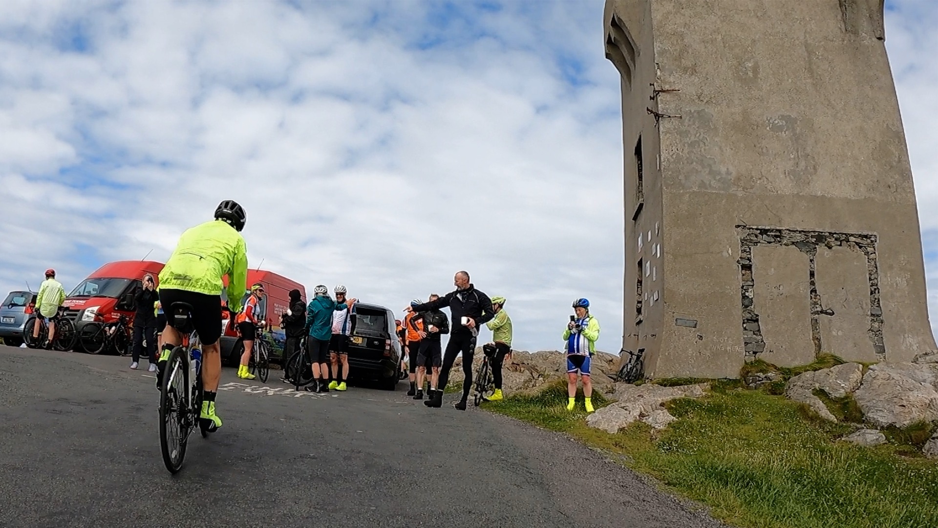 We didn’t linger long at the morning brew stop give the conditions. For many miles I was cycling with Julia, Lucy, Tizzie and Ken, and I confess I found this stage strangely satisfying, defying the elements. I’d have preferred sunshine but there are times when you just cope with what nature throws at you. We passed close to Mullaghmore, where Lord Louis Mounbatten was assassinated by the IRA along with three others in August 1979.