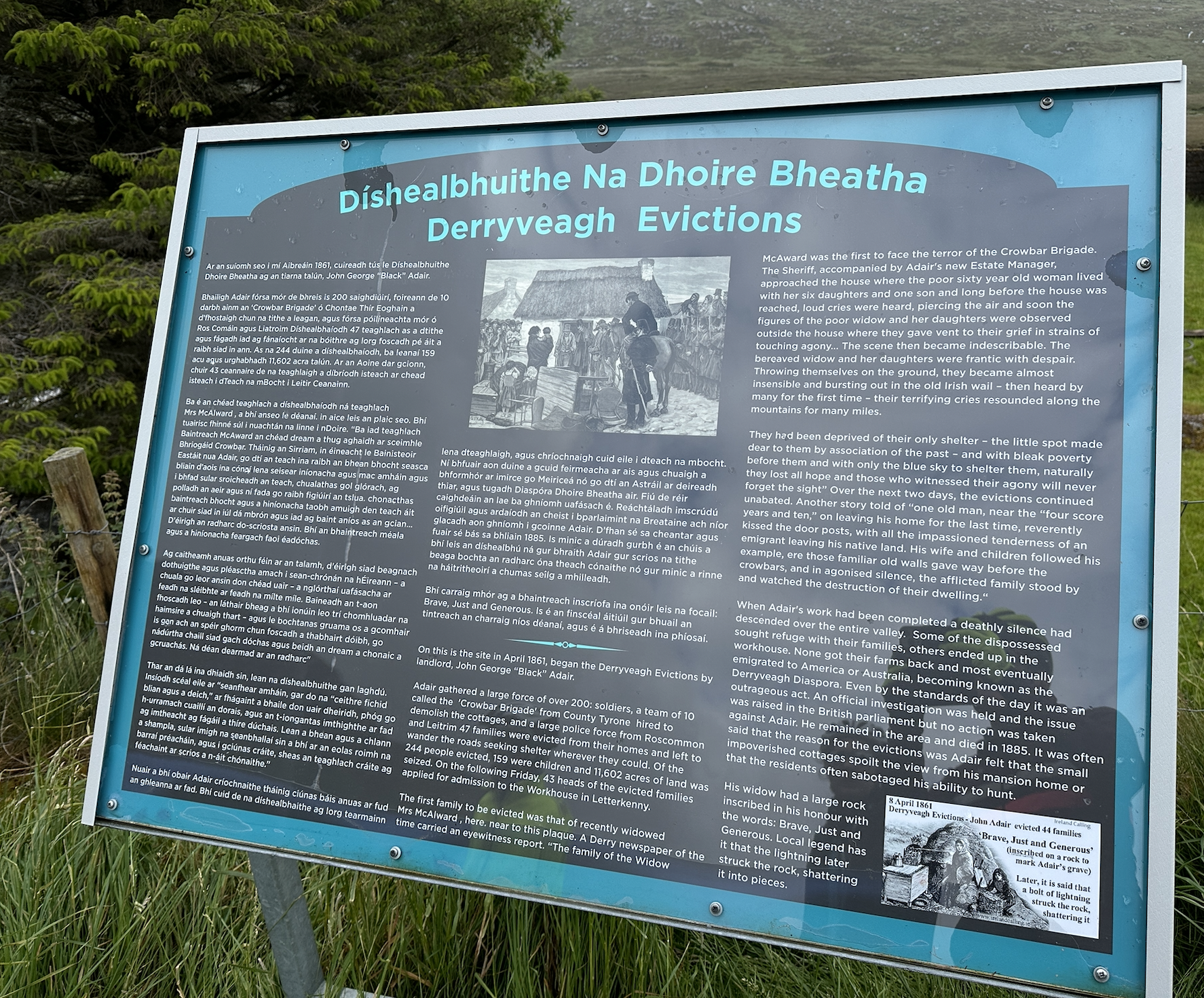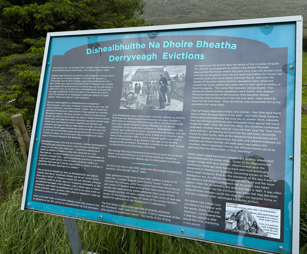 It was sobering to read how landlord George Adair evicted almost 250 tenants from their homes here in 1861, leaving them helplessly roaming the hills in search of shelter. The plaque tells the story of one victim, recently widowed Mrs McAlward. I confess we smiled at the melodramatic account of how she let out an ‘Irish wail … that resounded along the mountains for many miles’.