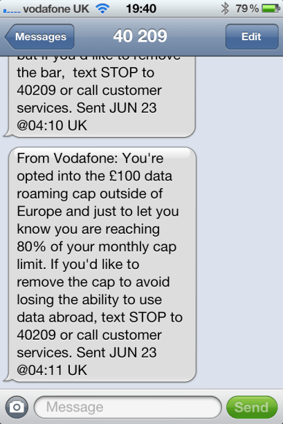 It gets worse. Vodafone send me texts (above) saying that I was halfway through my 5MB data allowance. At no point did they say I had used up the 5MB allowance. So I was appalled to get a further text saying I had used up 80% of the £100 cap on data outside Europe (below). So Vodafone’s texts to me went straight from saying I was more than halfway through a 5MB allowance and would be charged £15 for exceeding it to telling me  I had used £80 of data. How incredibly irresponsible and misleading. (I’m now been told I had used 30MB.)